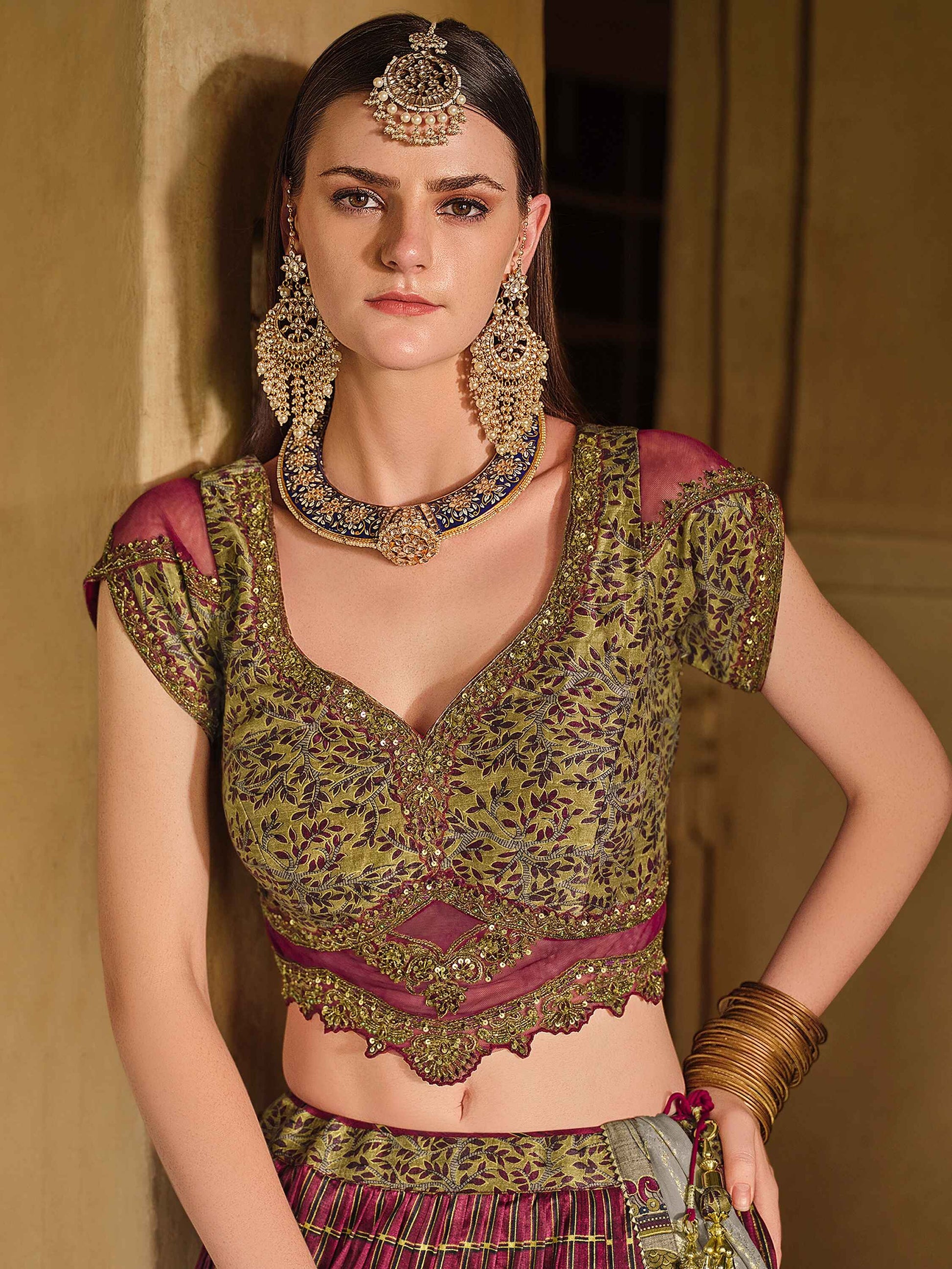 - Step into a world of refined beauty with this wine-colored lehenga, where tradition meets contemporary design. Its vibrant foil print breathes life into the classic silhouette, making it ideal for bridesmaids and wedding guests alike.