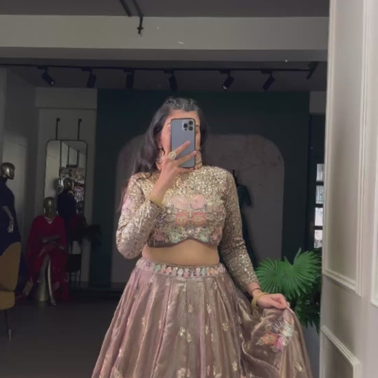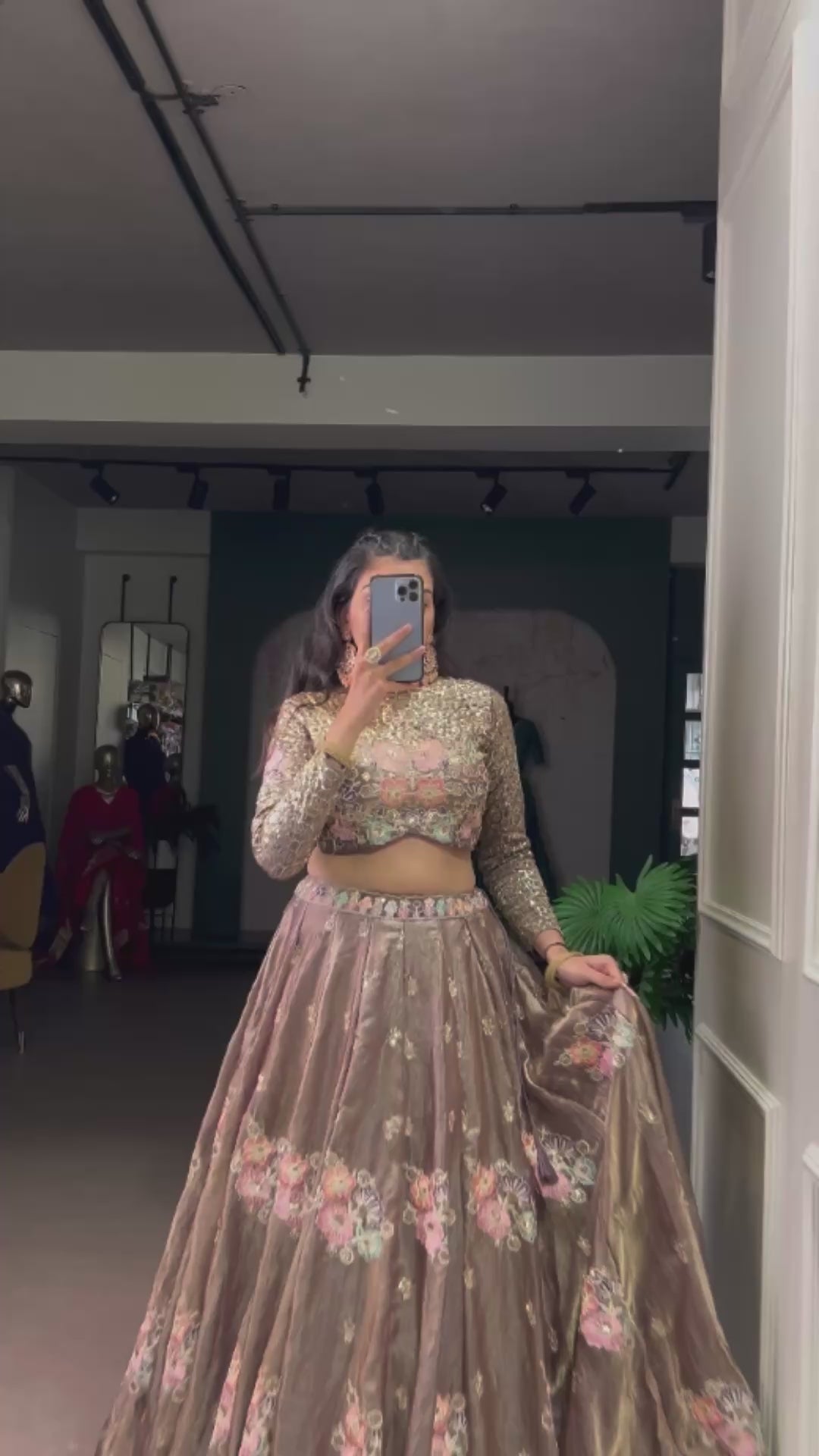 - This onion color lehenga choli comes with a blouse which is similar to the shade of the lehenga with sequince and thread embroidery work.