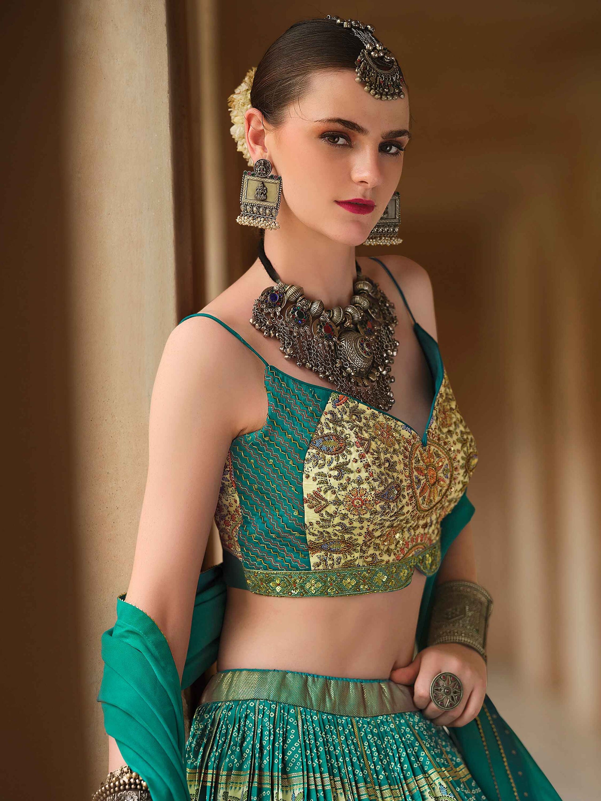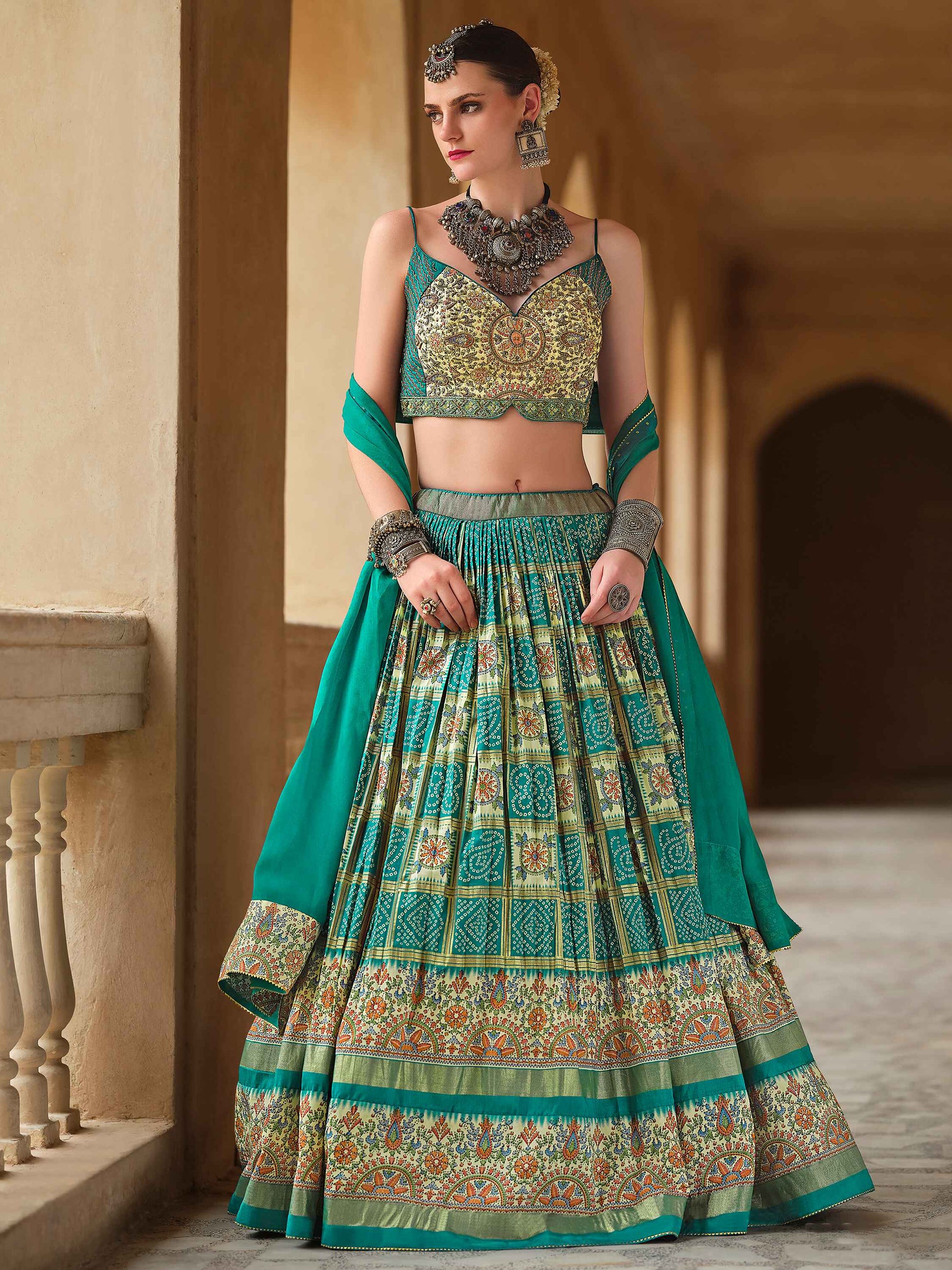 - Celebrate upcoming weddings and special occasions with a breathtaking green lehenga. The vibrant bandhani foil print exudes a modern yet traditional charm, perfect for any celebration.