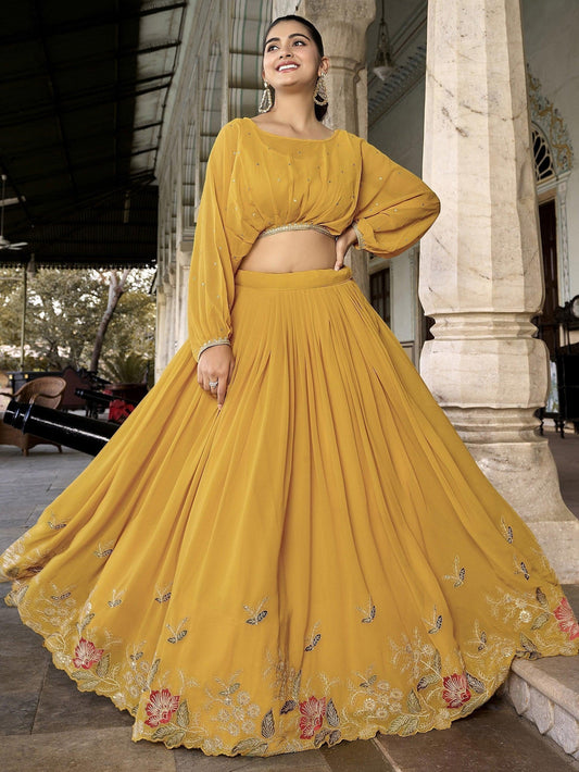 Alluring Yellow Embroidered Georgette Indo-Western Crop Top Lehenga