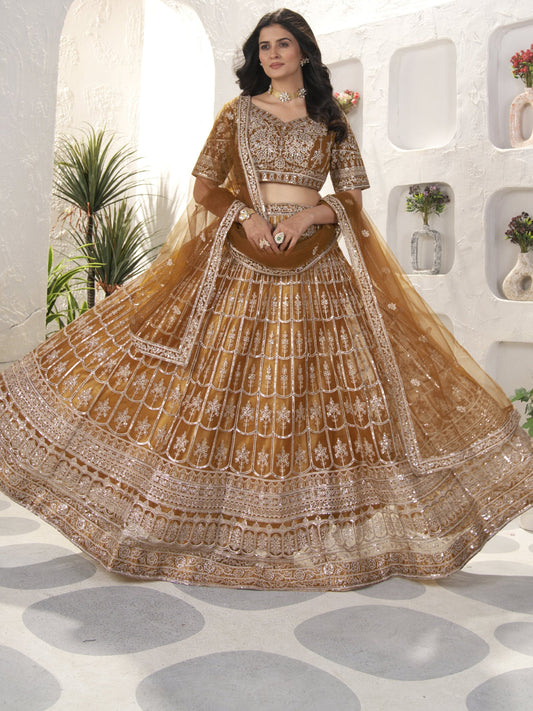 Beautiful Golden Sequins Work Net Wedding Lehenga Choli With Dupatta