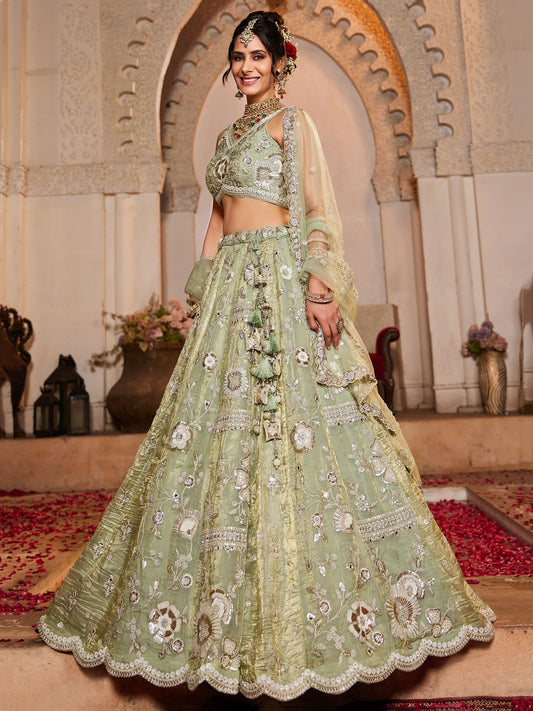Attractive Pista Green Sequins Work Tissue Silk Bridal Lehenga Choli