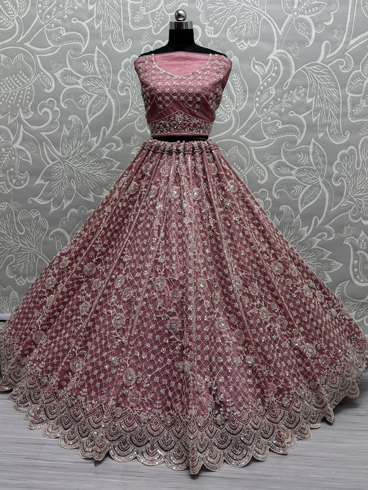Alluring Purple Thread Embroidery Net Wedding Lehenga Choli
