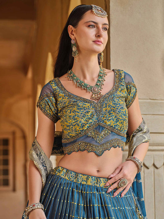 Captivating Blue Zari Weaving Silk Indo-Western Crop Top Lehenga